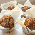 - Spoon into 4 parchment-lined muffin tins, and sprinkle turbinado or cinnamon sugar generously on top.