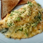 9. Check a few minutes later and the cheese should be melted, and the eggs cooked nearly all the way through. At this point fold the omelet in half and plate.